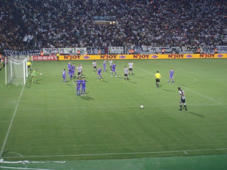 Fun and games came at the other end, when Cudicini was deemed to committed a foul, as the ball seemed to run out of play anyway. Cudicini also got booked. PAOK’s left back, the Brazilian Lino scored, and raced to the corner flag near the Spurs section to celebrate. It took quite a while to draw his attention to the fact that the referee wanted the kick re-taken due to encroachment! Cudicini seemed to move for the re-take, and with some advertising hoarding blocking my view a bit, I thought he had made a save, but Lino had put the shot wide!