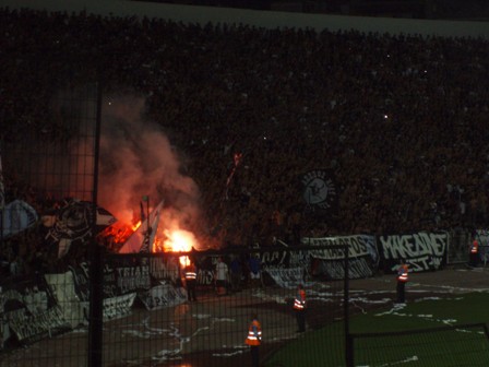 The young Spurs side looked like minnows really in the face of the noise and passion generated not only in the build-up to the game, but throughout. Any time Spurs were in possession, the whistles and jeers were directed in great decibels. The “Gate 4” flag and other massive PAOK flags were regularly displayed. Despite UEFA regulations, firecrackers were regularly set off.