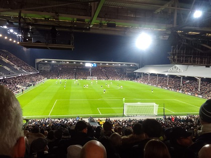 The match had been delayed because of public transport problems (The District Line had been suspended on the tube) and there was a further delay because referee Paul Tierney was having technical issues with his radio equipment. Spurs kicked off, playing away from the Putney End. Now that Fulham are enjoying success and attract more home fans there is less room for travelling fans in what used to be a “neutral” section. The Spurs section was in good voice throughout with support for the team, Antonio and of course Kane, but they were soon on the back of Daniel Levy (in both halves).